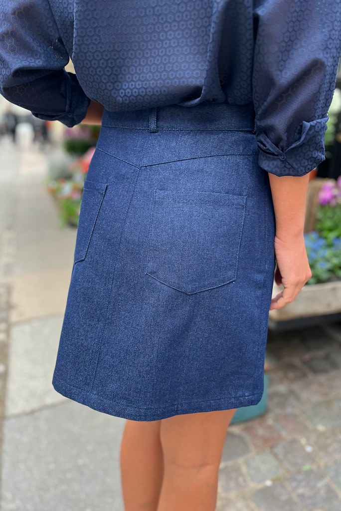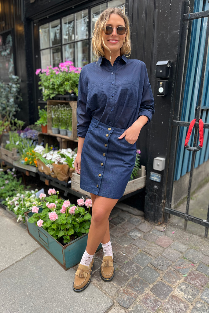 Catherina har str. 36 på og hendes mål er: Talje: 68 cm / Hofte: 98 cm / Højde: 173 cm. (Nederdelen sidder lidt under taljen på Catherina. Ønskede hun den helt oppe i taljen skulle nederdelen have været str. 34)
