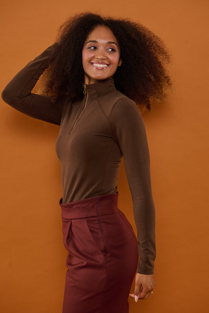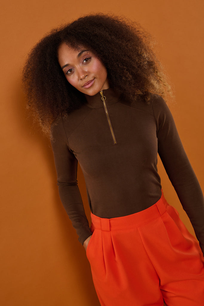 Farve: Varm mørkebrun med ribbet struktur & messing lynlås