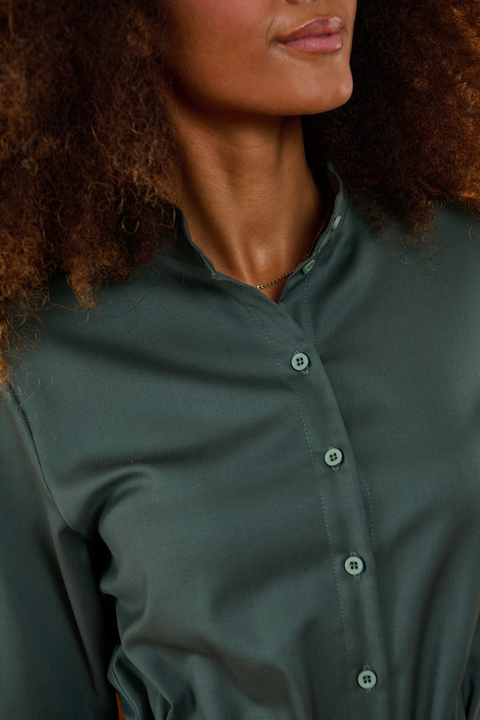 - Lange ærmer der er afsluttet med manchet lukning